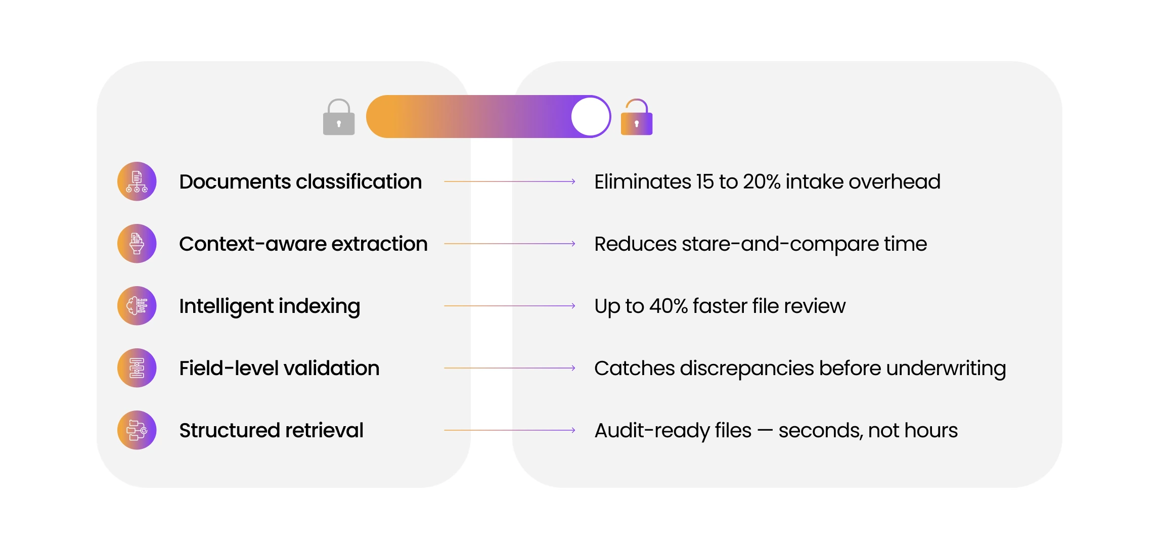 The following five capabilities address the specific failure points in document-heavy mortgage workflows. Each one reduces manual intervention at a distinct stage of processing — and each one has a direct effect on time, cost, or risk.