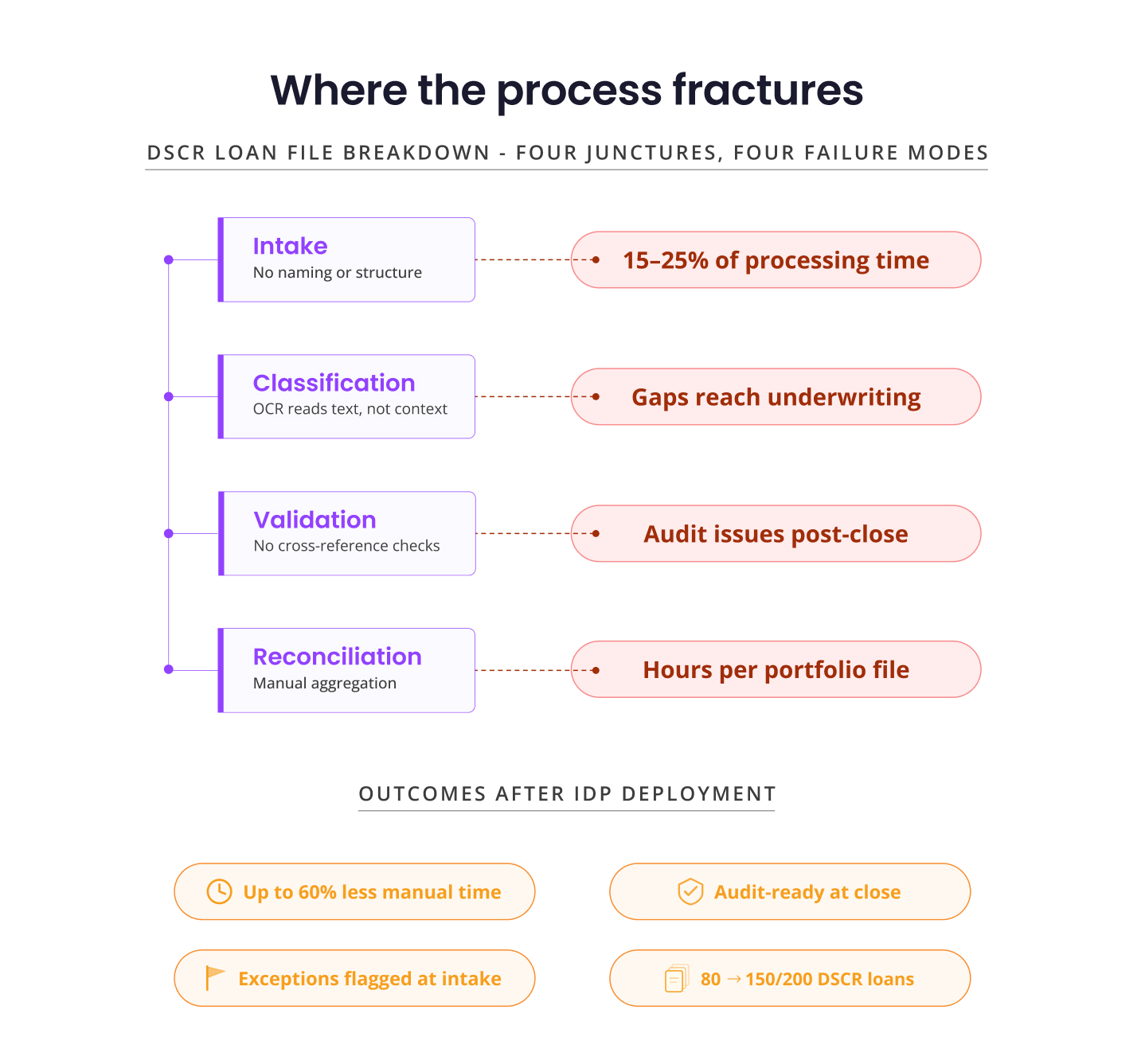Critically, throughput scales without proportional headcount growth. As an example, a team that earlier processed 80 DSCR loans per month at full capacity can now sustain 150 to 200 with the same staffing level, because the primary document-processing constraint is significantly reduced.